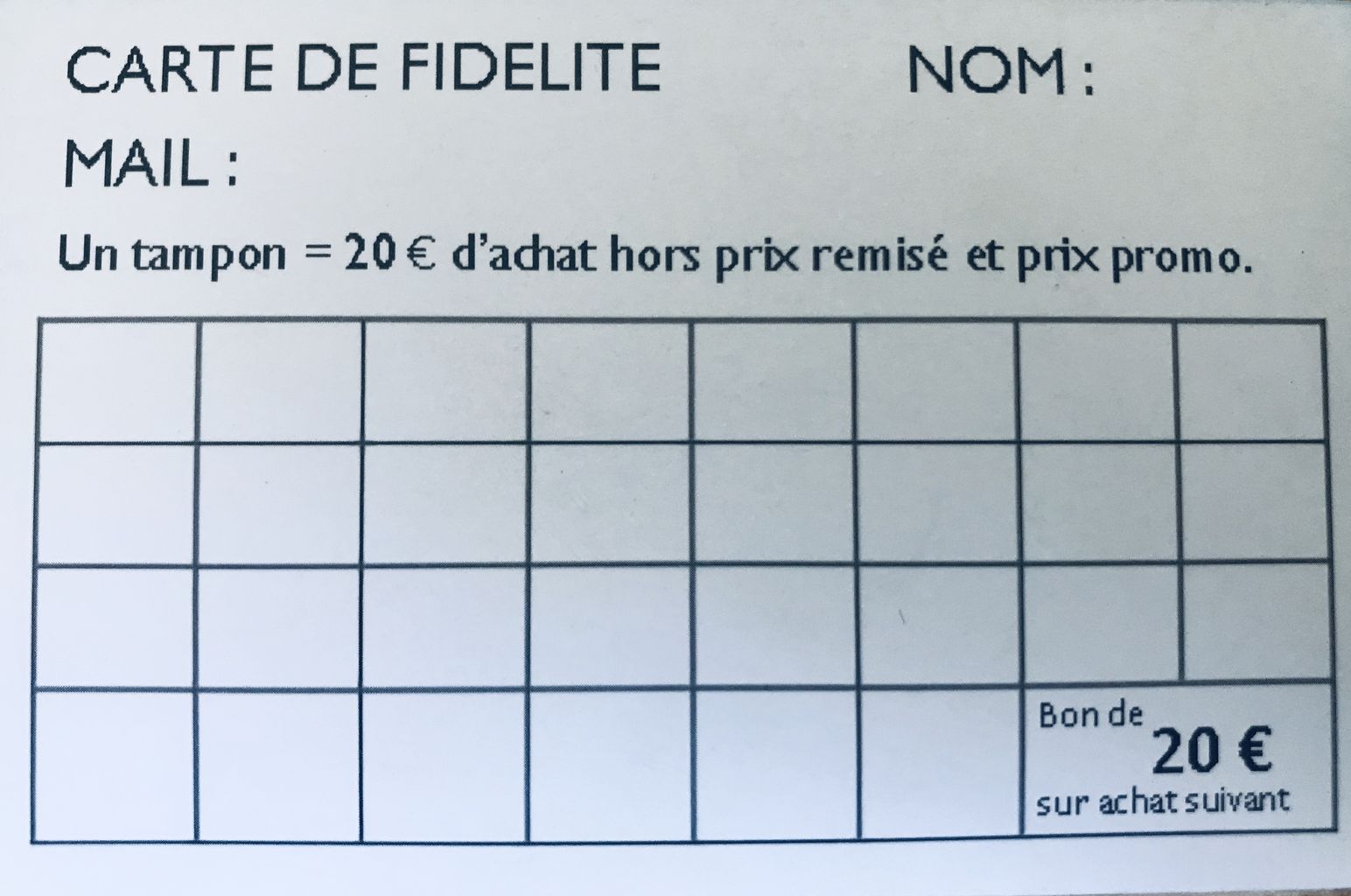 Votre fidélité est récompensée. Demandez votre carte de fidélité au moment du passage en caisse. Un tampon tout les 20€ d’achats, une fois votre carte remplie bénéficiez d’un chèque cadeau de 20€ !